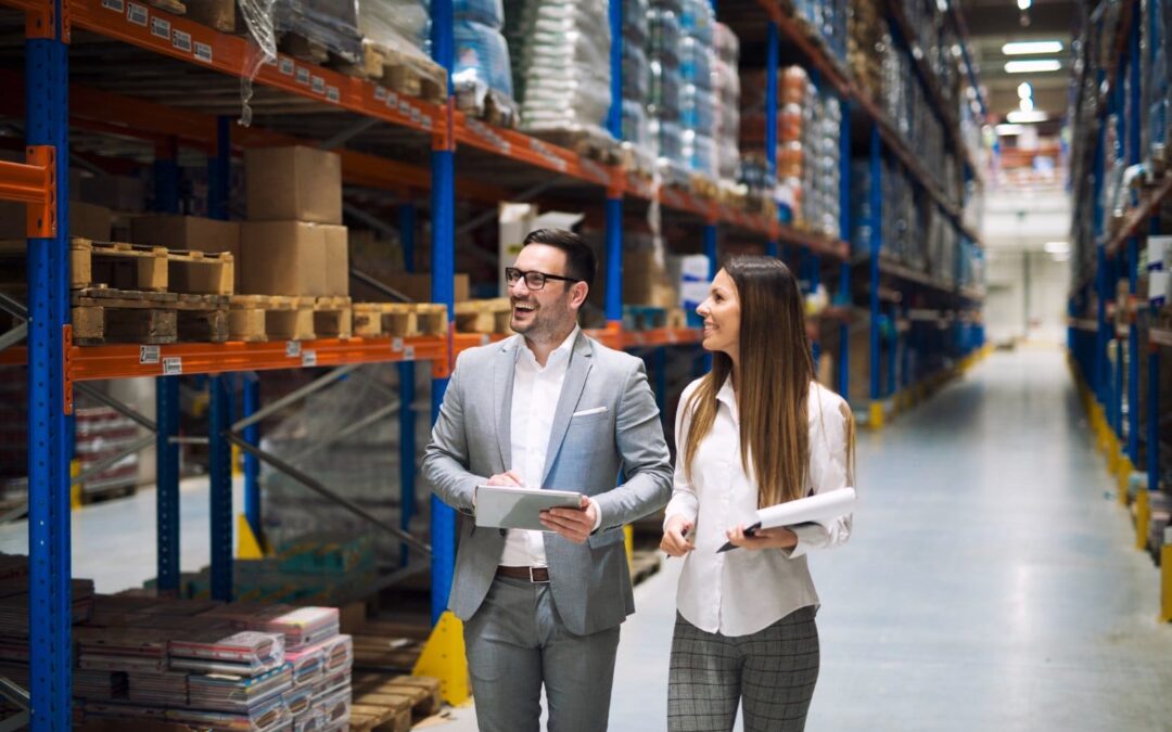 Two people walking in a warehouse